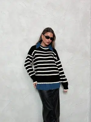 סריג צווארון פסים שחור לבן